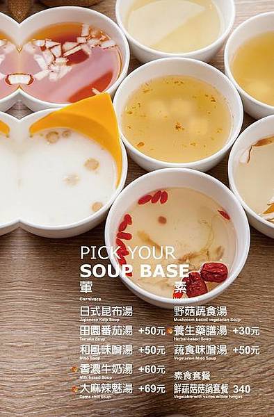 除了基本昆布湯、野菇蔬食湯其他需要加價哦!
